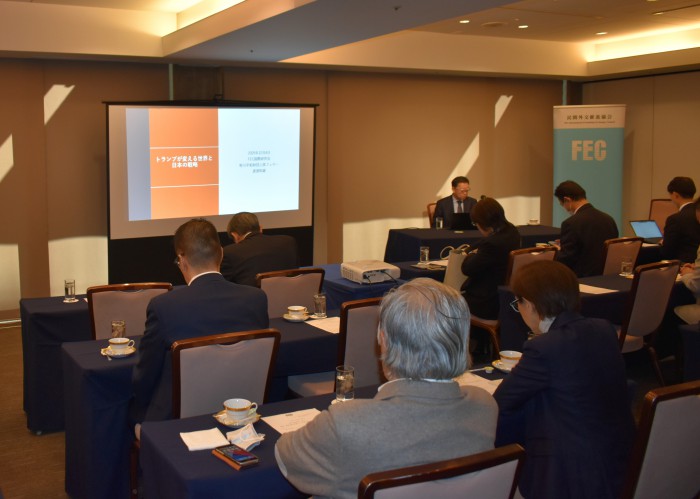 FECは12月4日、渡部恒雄笹川平和財団上席フェローを迎えて「トランプが変える世界と日本の戦略」をテーマに第50回米国研究会を国際文化会館にて開催した。小方俊也FEC専務理事の開会挨拶の後、渡部氏が講演を行い、最後に質疑応答が行われた。