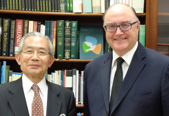 ポール・カヴァナ駐日アイルランド大使を湯下FEC専務理事が表敬訪問 日欧文化経済委員会 2019年05月15日更新 ポール・カヴァナ駐日アイルランド大使(右) とき 2019年4月10日(水) ところ アイルランド大使館 内容 湯下博之FEC専務理事は、ポール・カヴァナ駐日アイルランド大使を訪問した。大使は国連関係の勤務を重ねて1996年から2年間、在東京国際連合広報センター所長を務めたことのある外交官で、駐フランス大使、駐中国大使、駐アラブ首長国連邦大使を経て、2018年9月に来日した。