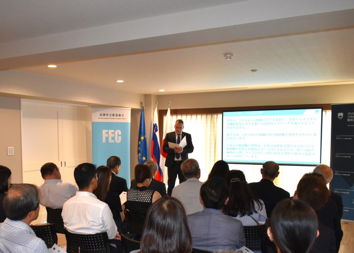 本日、スロベニア共和国大使公邸にて皆様にご挨拶をできることを大変喜ばしく思っている。私はFECの皆様が、日本とさまざまな国際組織との間の結びつきを強化する為に、重要な役割を果たしてきたことを深く認識している。日本と世界各国との架け橋となる上で、FECは欠かすことのできない組織であるといえるだろう。FECの活動が、公的な領域で生み出される全てのものを見事に補完しているという事実は、高く評価されている。