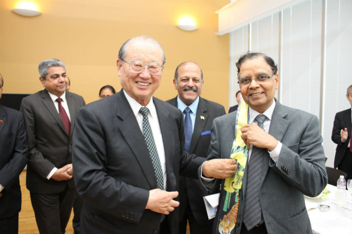 民間外交推進協会(FEC)の松澤建理事長らは、5月17日、アルビンド・パナガリヤ・インド行政委員会(NITI Aayog)副委員長の来日を機に在日インド大使館からの招待を受け、大使館での昼食会に出席した。昼食会にはインド側からパナガリヤ副委員長の他、スジャン・チノイ大使、アミット・クマール次席公使、アルビンド・シン公使(経済担当)等7名、FEC側からは松澤建FEC理事長、平林博FEC日印文化経済委員会顧問・日印協会理事長、宿利正史国際高速鉄道協会理事長、元国土交通省次官等5名が出席した(その他商社関係者やエコノミスト8名)。モディ首相の右腕として知られるパナガリヤ副委員長は、昨年設立されたインド政策委員会で委員長も兼任するモディ首相と共に、インドの継続的な成長と繁栄の為に改革を推し進める中央政府の中心人物。今回は、インド高速鉄道に関する日本側との合同委員会に出席の為にインド代表団の団長として来日された。昼食会ではチノイ大使の歓迎挨拶の後、本場のインド料理を楽しみながらパナガリヤ副委員長の話を伺った。