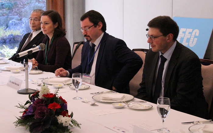 FECは12月16日、マキシム・シェレイキン・ロシア連邦技術開発庁長官らの歓迎昼食会を国際文化会館にて開催した。昼食会にはロシア技術開発庁からシェレイキン長官の他、レオニード・アガフォノフ次官、エカテリーナ・クリクノヴァ国際ネットワークマネージャーが、FEC側から松澤建理事長、森敏光日露文化経済委員会委員・元駐ハバロフスク総領事、原大双日㈱代表取締役副会長、苫米地英人コグニティブリサーチラボ㈱代表取締役CEO・極東連邦大学客員教授、江戸靖夫日本通運㈱グローバルフォワーディング企画部次長ら8名が出席した。ロシア技術開発庁は、本年6月にプーチン大統領の指示により新設されたロシアの投資環境整備・中小企業育成を主な目的とした組織である。