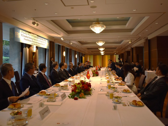 FECは12月18日、日ASEAN特別首脳会議に出席のため来日中のファム・ミン・チン・ベトナム社会主義共和国首相との歓迎朝食会をホテルニューオータニ東京で開催した。朝食会には、ベトナム側からチン首相のほか、ダオ・ゴック・ズン労働大臣、グエン・チー・ズン計画投資大臣、ダオ・ホン・ラン保健大臣、グエン・キム・ソン教育訓練大臣、ファム・クアン・ヒエウ駐日ベトナム大使等15人、FEC側からは松澤建FEC理事長、尾ノ井芳樹FEC日越文化経済委員会委員長(電源開発㈱エグゼクティブ・シニアフェロー)等17人が出席した。
