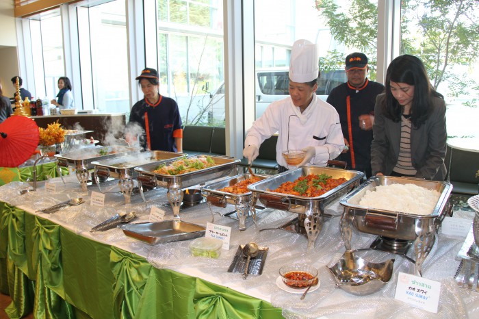続いて、アッチャリヤー・スックソンバット大使公邸専属シェフによりタイ料理二品「白身魚のあんかけソース」と「鶏ひき肉入り包み揚げ」のデモンストレーションが行われた。デモンストレーションはシェフの料理する手元をスクリーンに大きく映しながら進行。参加者からは日本ではなじみの無い調味料や調理方法についてなど質問もあり、出来上がった料理を写真に撮影するなど和やかに行われた。デモンストレーション後に大使館より参加者全員に準備された鶏ひき肉入り包み揚げが配られ試食。最後に参加者全員が本場のタイ料理に舌鼓をうった。