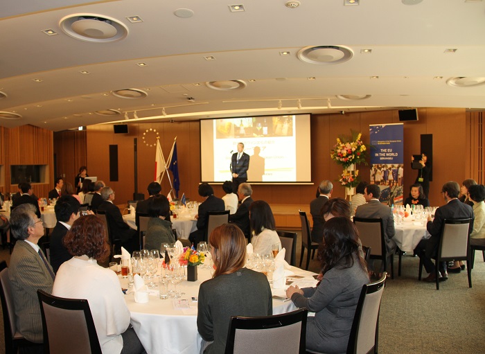 民間外交推進協会(FEC)は3月2日、駐日EU代表部との交流会を開催した。交流会にはEU代表部からイスティチョアイア=ブドゥラ大使の他、代表部の職員が出席、FEC側からは松澤建FEC理事長、渡邊五郎アムハーストアソシエイツ(有)取締役社長、水沼正剛電源開発㈱シニアフェロー、三浦洋有限責任あずさ監査法人専務理事、そして東京LFECからは鳥羽和江東京LFEC代表幹事をはじめ15人、合わせて31人が出席した。この交流会は今年2月に松澤理事長とブドゥラ大使が懇談した際に、民間との交流を深めたいとの大使の要望を受けて開催することが決まった。