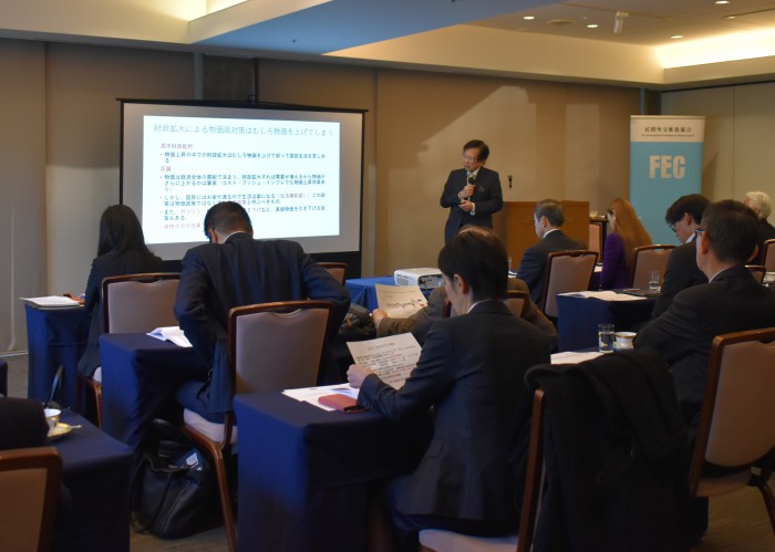 本田悦朗元内閣官房参与をお招きし、第301回国際研究会を開催 国際研究会 活動報告 2026年03月11日更新 とき 2026年01月22日(木) ところ 国際文化会館 内容 FECは1月22日、本田悦朗TMI総合法律事務所特別顧問(元内閣官房参与)をお迎えして「高市政権の経済政策」をテーマに第301回国際研究会を国際文化会館にて開催した。松澤建FEC理事長の開会挨拶の後、本田氏が講演を行い、最後に質疑応答が行われた。